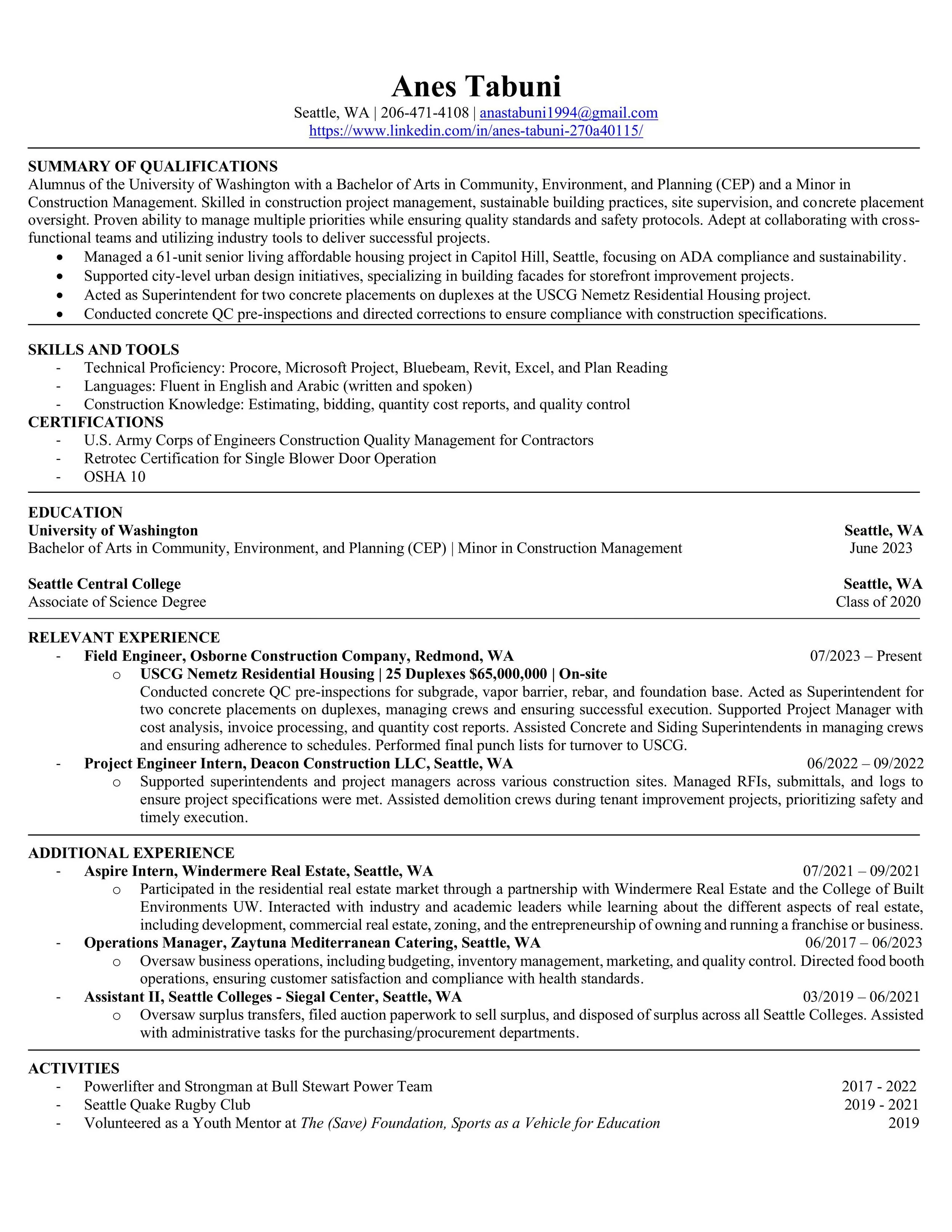 Hi, my name is Anes Tabuni, and I graduated from the University of Washington with a Bachelor of Arts in Community, Environment, and Planning (CEP) and a minor in Construction Management. I am eager to take on leadership roles in the community, to educate myself in becoming an active steward for the environment, and to engage in mindful planning to implement positive change. In my free time I enjoy backpacking (and other outdoor activities), playing rugby, and working out. I also have a passion for photography. I love capturing how the built environments interacts with our surroundings and natural world. Through these activities I have learned how to be strong-willed and a team player.